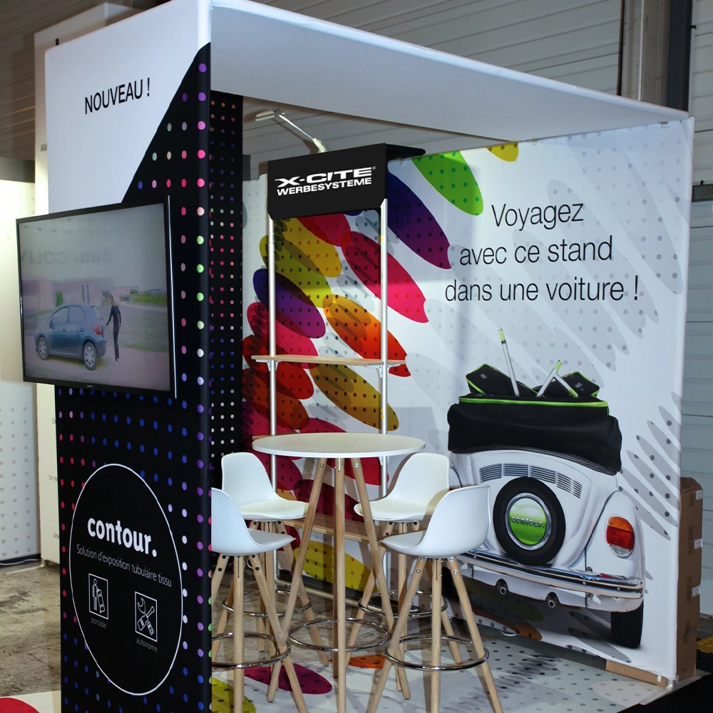 Contour ist ein leichtes, werkzeugfrei aufbaubares Rohrrahmensystem mit bedrucktem Spannstoff. In nur 10 Minuten einsatzbereit, passt es in eine kompakte Rolltasche und ist ideal für mobile Einsätze. Die modulare Struktur erlaubt individuelle Erweiterungen mit Monitoren, Regalen oder Beleuchtung. Contour ist wiederverwendbar, nachhaltig und erfüllt internationale Messestandards. Perfekt für alle, die flexibel, kosteneffizient und professionell auftreten möchten – ganz ohne externe Hilfe.Technische Daten