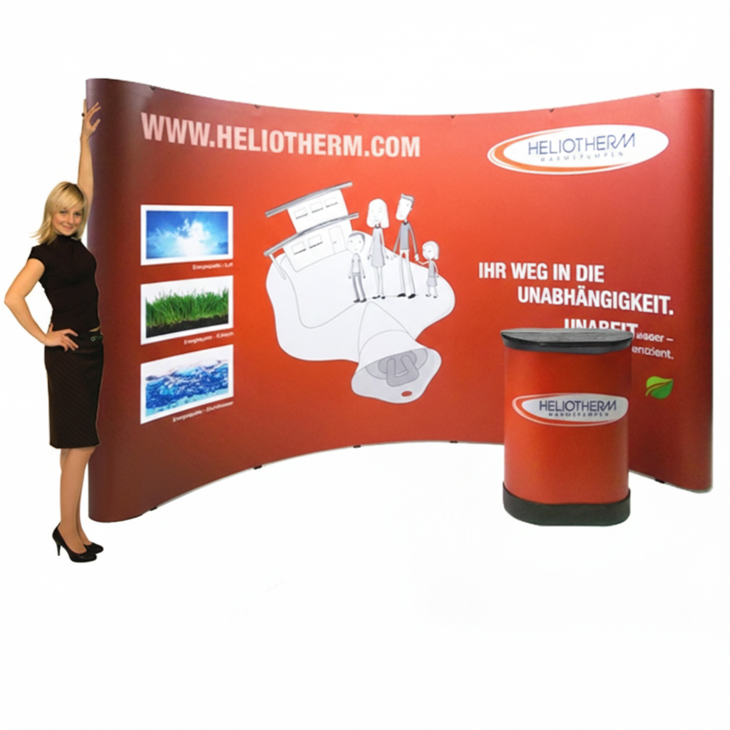 Eine Faltdisplay Messewand ist in verschiedenen Größen und Formen erhältlich – von kompakten Tischdisplays bis hin zu großformatigen Rückwänden, die eine komplette Standfläche abdecken können. Die passende Größe richtet sich nach Ihren Anforderungen und der verfügbaren Ausstellungsfläche.
