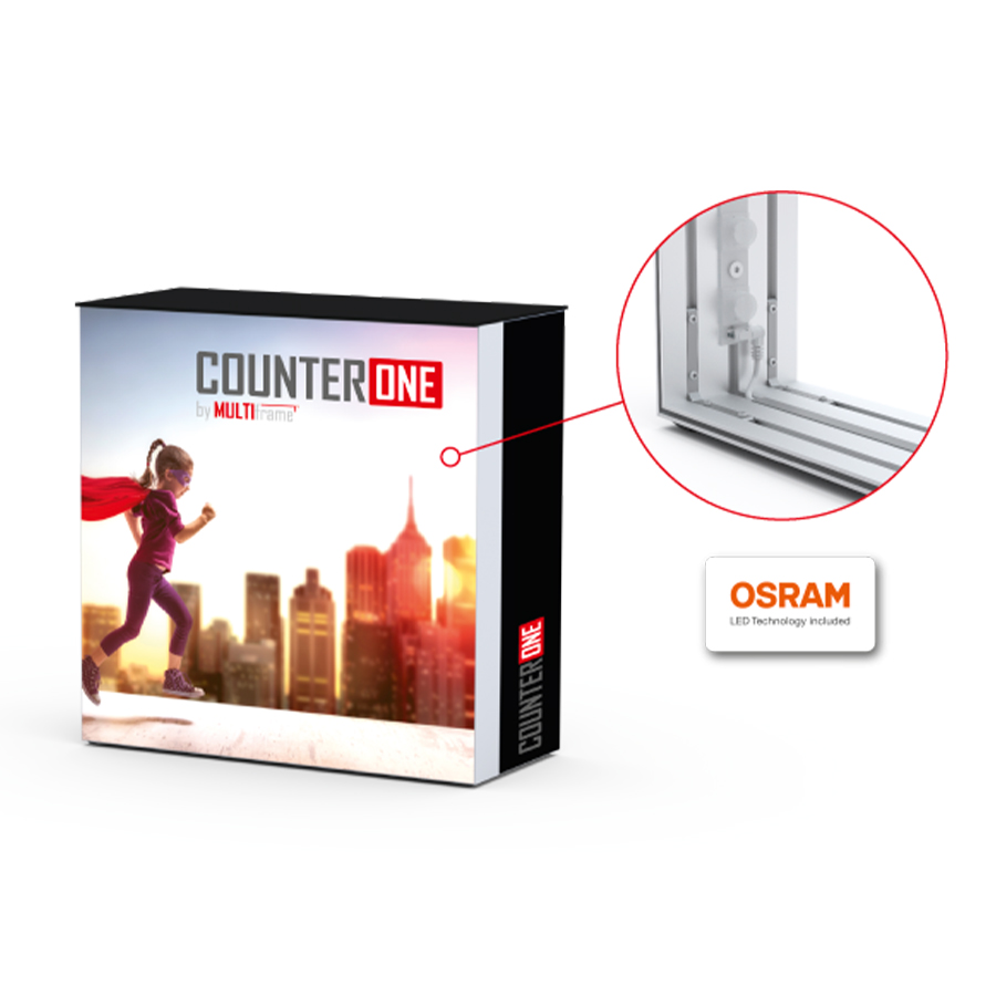 Der freistehender, Counter/Theke mit LED Hinterleuchtung ist ideal für Messen, Ausstellungen, Promotions usw. Der edle LED Leuchtrahmen präsentieren Ihre Botschaft perfekt.