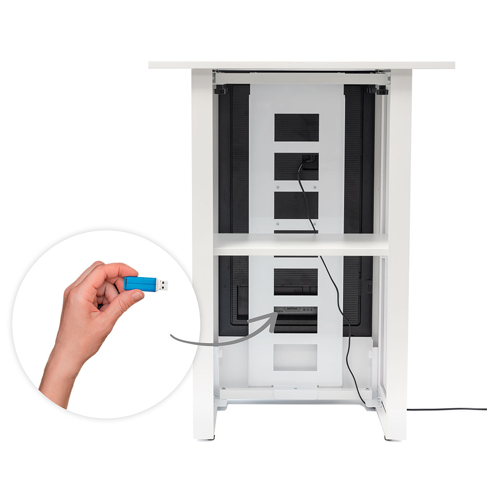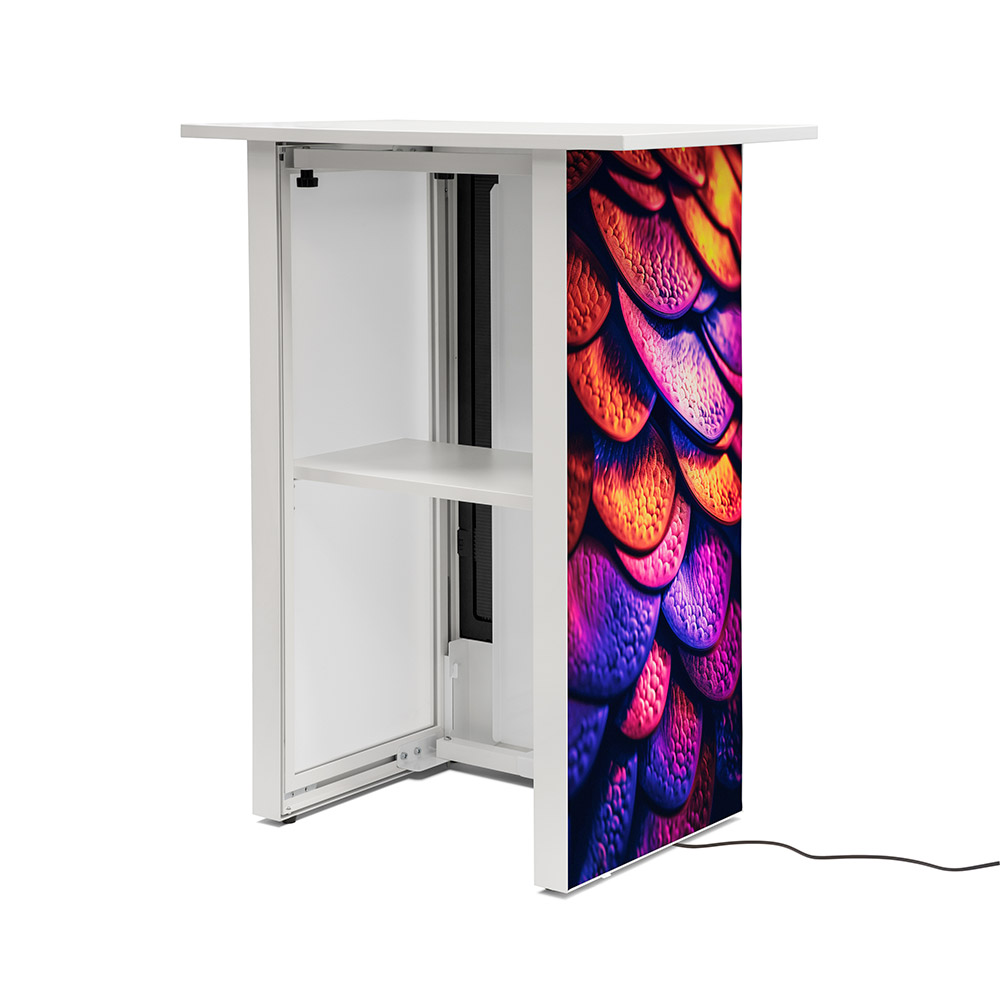 Die Zukunft der Werbetheken Hochwertig und futuristisch: So präsentiert sich die Messetheke Digital. Alles Notwendige ist vorhanden. Dank der werkzeuglosen Montage haben Sie die digitale Theke im Handumdrehen aufgebaut. Das Regal im Inneren bietet Ihnen die Möglichkeit, Dinge zu verstauen, damit die Aufmerksamkeit nur auf Ihre Werbung gerichtet ist. Heben Sie Ihre Präsentation auf die nächste Stufe und zeigen Sie Ihre Marke, Ihr Unternehmen oder Ihr Produkt auf Messen, Veranstaltungen, in Einkaufszentren, Shops und mehr.Branding / Aufdruck