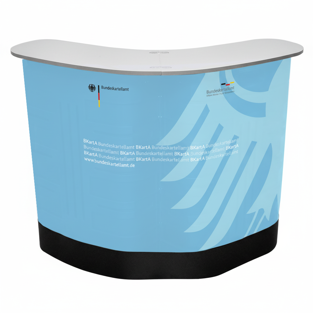 Die Werbetheke / Messetheke Expo kann einzeln, oder als optimale optische Abrundung Ihres Faltdisplays Classic verwendet werden. Für alle Veranstaltungen, Promotionaktionen, Messen, Kongressen, Seminaren und Präsentationen geeignet.Lieferzeit