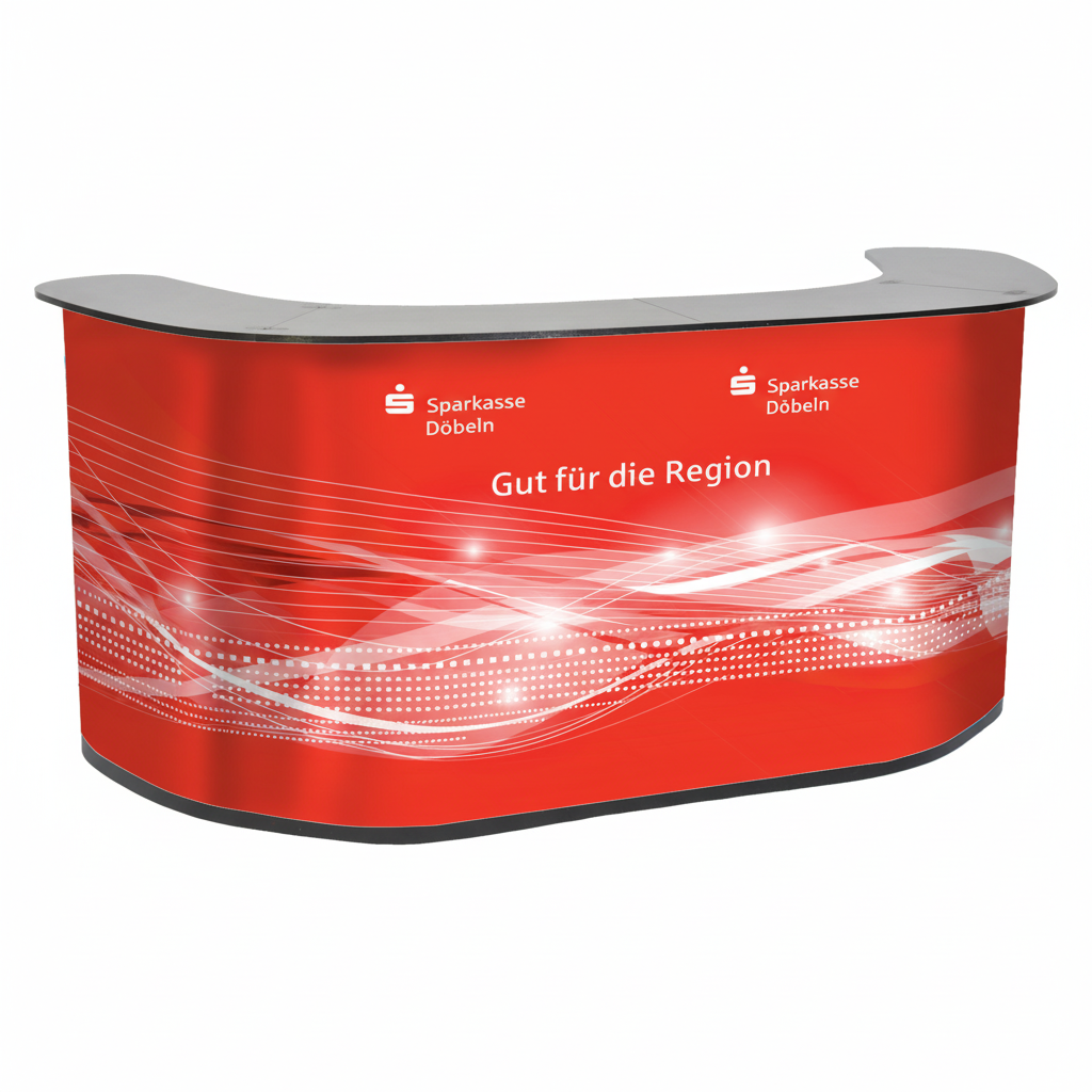 Die Werbetheke / Messetheke Expo XL kann einzeln, oder als optimale optische Abrundung Ihres Faltdisplays Classic verwendet werden. Für alle Veranstaltungen, Promotionaktionen, Messen, Kongressen, Seminaren und Präsentationen geeignet.Lieferzeit