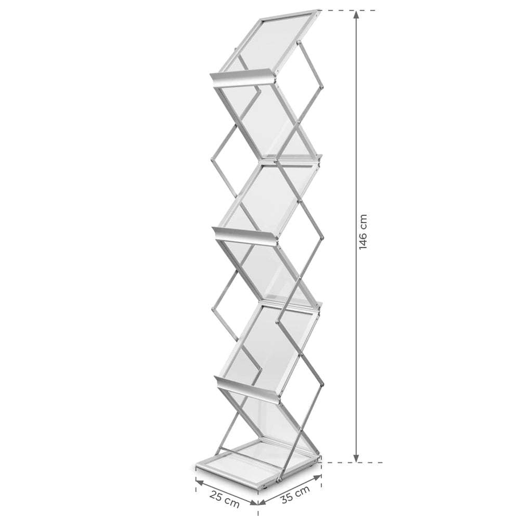 Unser Prospektständer Elegant ist die perfekte Lösung für mobile Präsentationen: hochwertig, klappbar und im Handumdrehen einsatzbereit. Die stabile Zick-Zack-Konstruktion aus eloxiertem Aluminium und pulverbeschichtetem Stahl bietet fünf DIN-A4-Ablagen aus klarem Acryl. Einfach Koffer öffnen, auseinanderziehen, arretieren – schon steht ein geräumiger, beidseitig nutzbarer Prospekthalter bereit. Erhältlich in Silber und Schwarz. Der Aluminiumrahmen-Koffer schützt beim Transport und bleibt mit nur 7 kg angenehm leicht. Anwendungsbereich