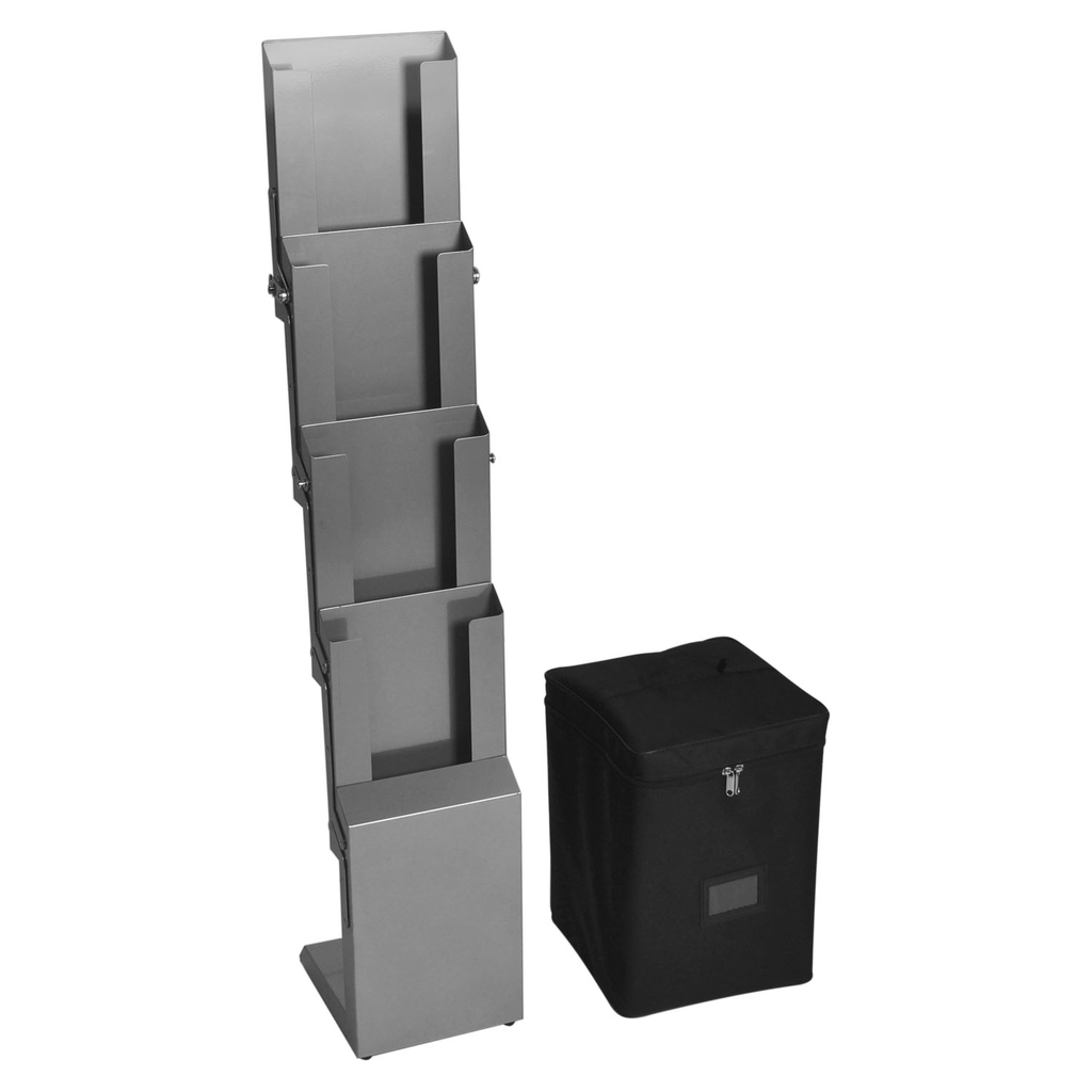 Der Prospektständer Premium vereint Stabilität und Eleganz: aus pulverbeschichtetem Stahl gefertigt, robust und hochwertig. Mit 4 Prospektfächern in Silber, Schwarz oder Weiß passt er perfekt zu jedem Ambiente. Im Set enthalten: Prospektständer im Karton plus praktische Nylontasche – ideal für Messen, Ausstellungen oder den flexiblen Einsatz im Büro. Tipp: Für den Transport einfach die Tasche um den Karton legen.Branding / Aufdruck
